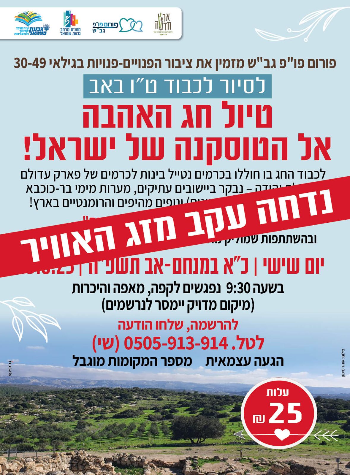 יום שישי, י"ד במנחם-אב תשפ"ה, 15.8.25, בשעה 9:30 (מיקום מדויק יימסר לנרשמים)